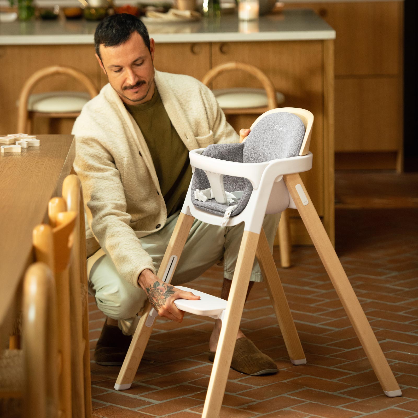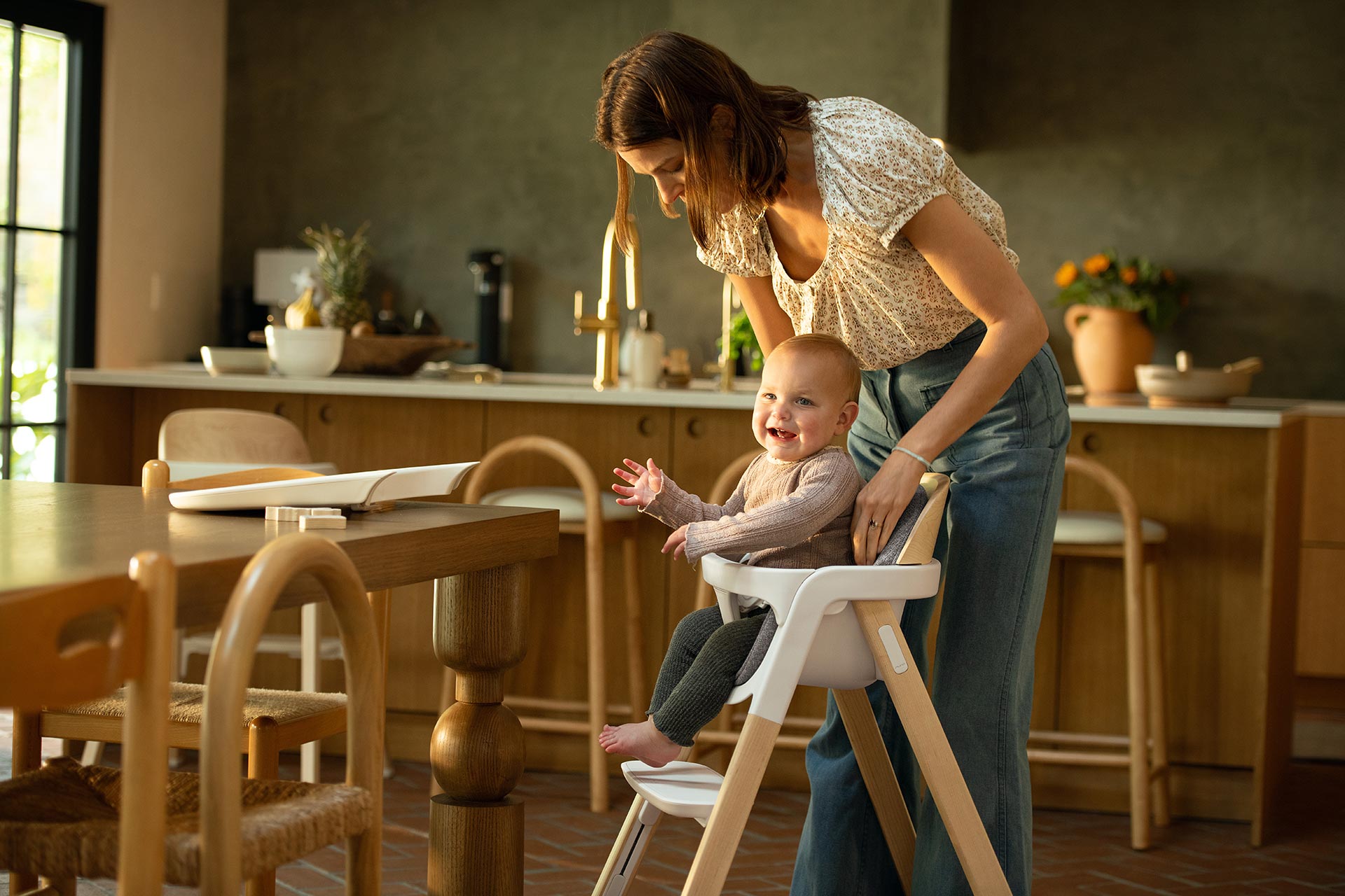 Picture this: sleek lines, warm wood accents, and an intuitive design that not only decorates your dining space with an heirloom furniture appeal but beautifully integrates baby into the heart of your shared family meals.