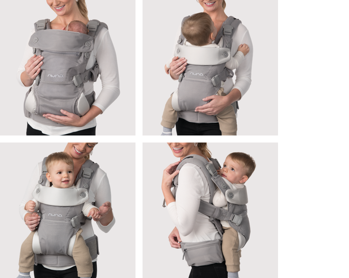 - Four carry positions provide optimal support as your child grows—for healthy body positioning necessary in spine and hip development.