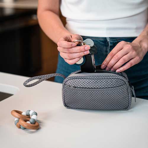 A: The removable pouch on the CUDL clik waistband will comfortably fit a spare diaper or two and wipes and/or keys and cell phone (iPhone 13 Pro Max).