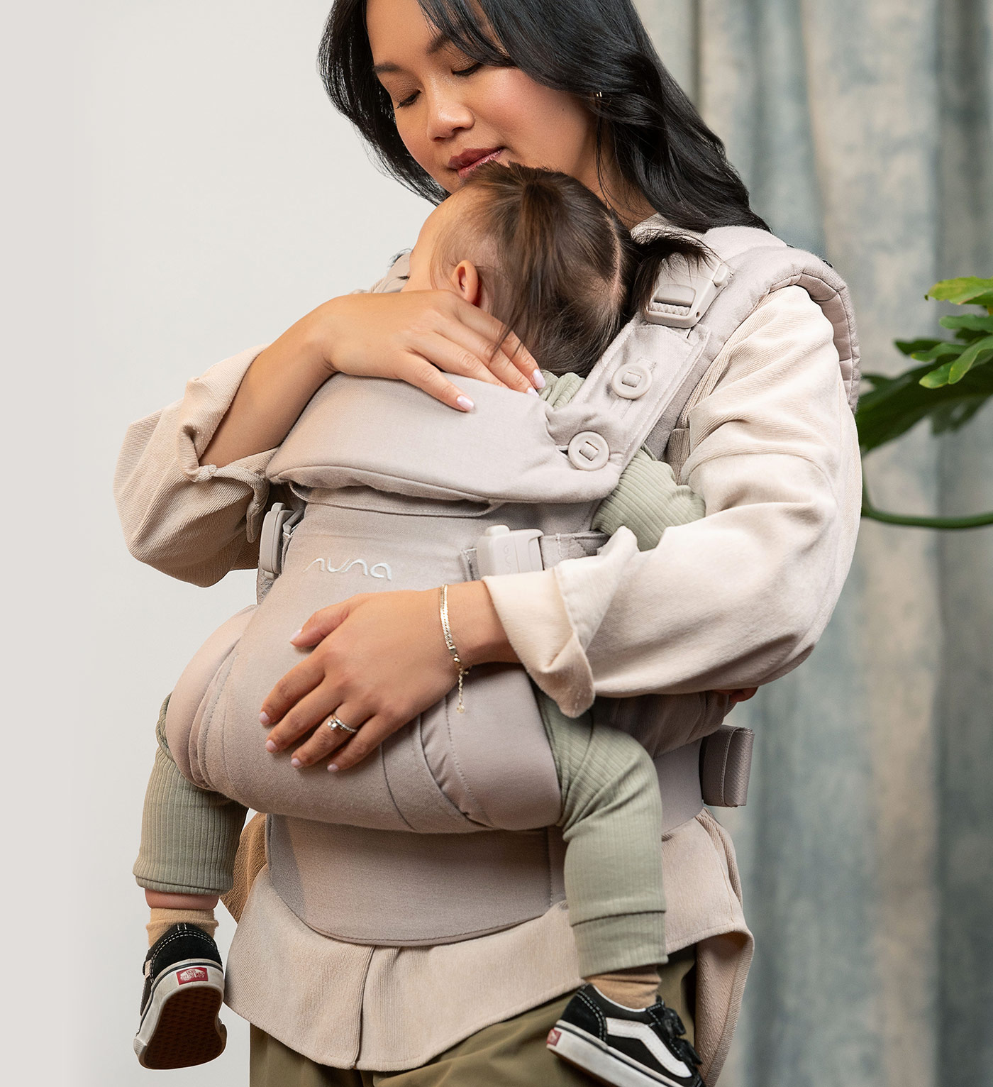 Close up of woman holding baby's hands in a CUDL luxe with detail of Magnetech snap on her shoulderClose up of woman holding baby's hands in a CUDL luxe with detail of Magnetech snap on her shoulder