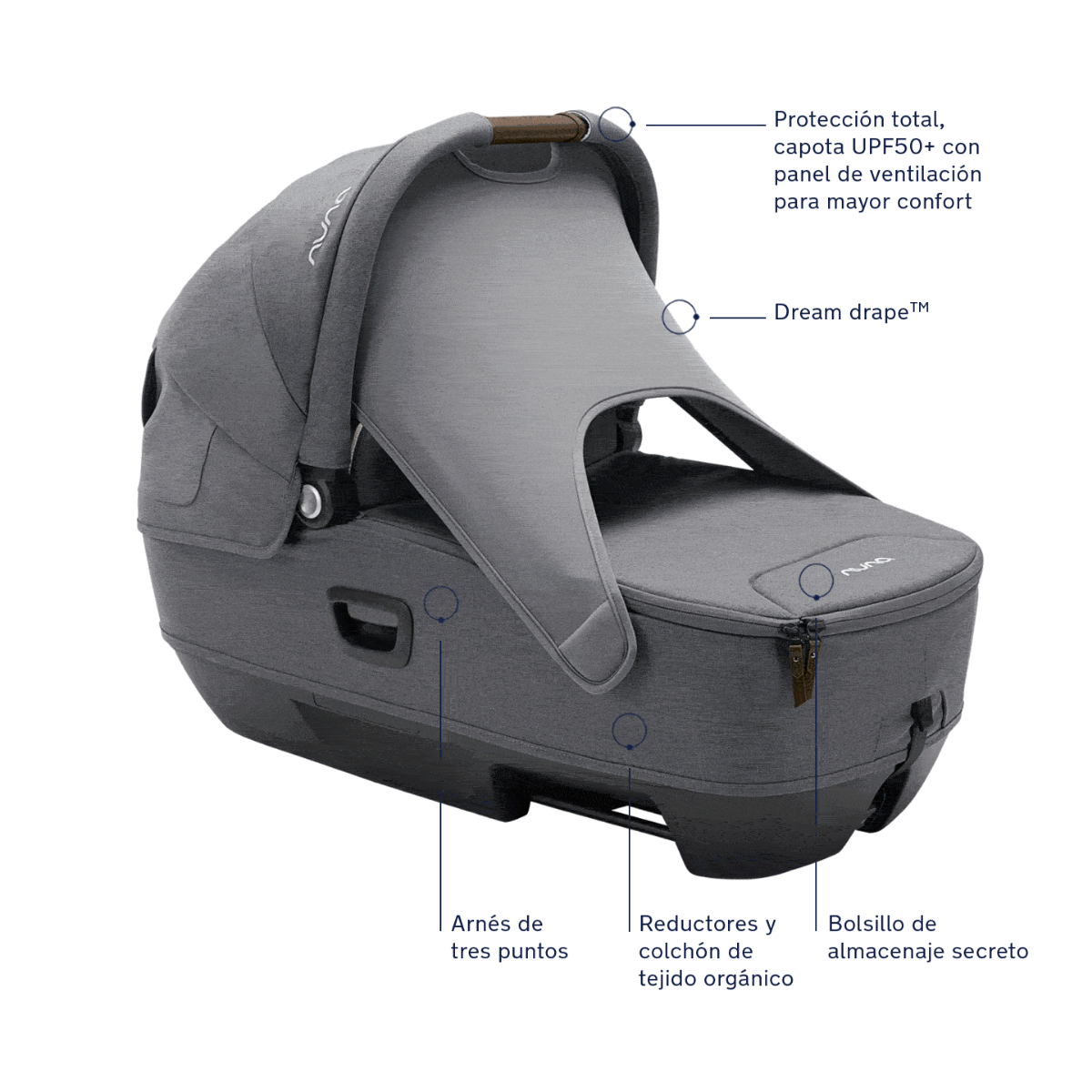 CARI NEXT, capazo-silla de auto. Súper confortable, permite al bebé descansar plácidamente y con reclinación total - la mejor posición para el desarrollo de la columna vertebral. Este capazo, compatible con NEXT system incorpora un colchón fabricado con tejido de punto orgánico y reductores de recién nacido para un confort óptimo, además de arnés de tres puntos para más seguridad. Muévelo de casa al coche o al cochecito o donde quiera que la vida te lleve mientras ellos sueñan felizmente.
