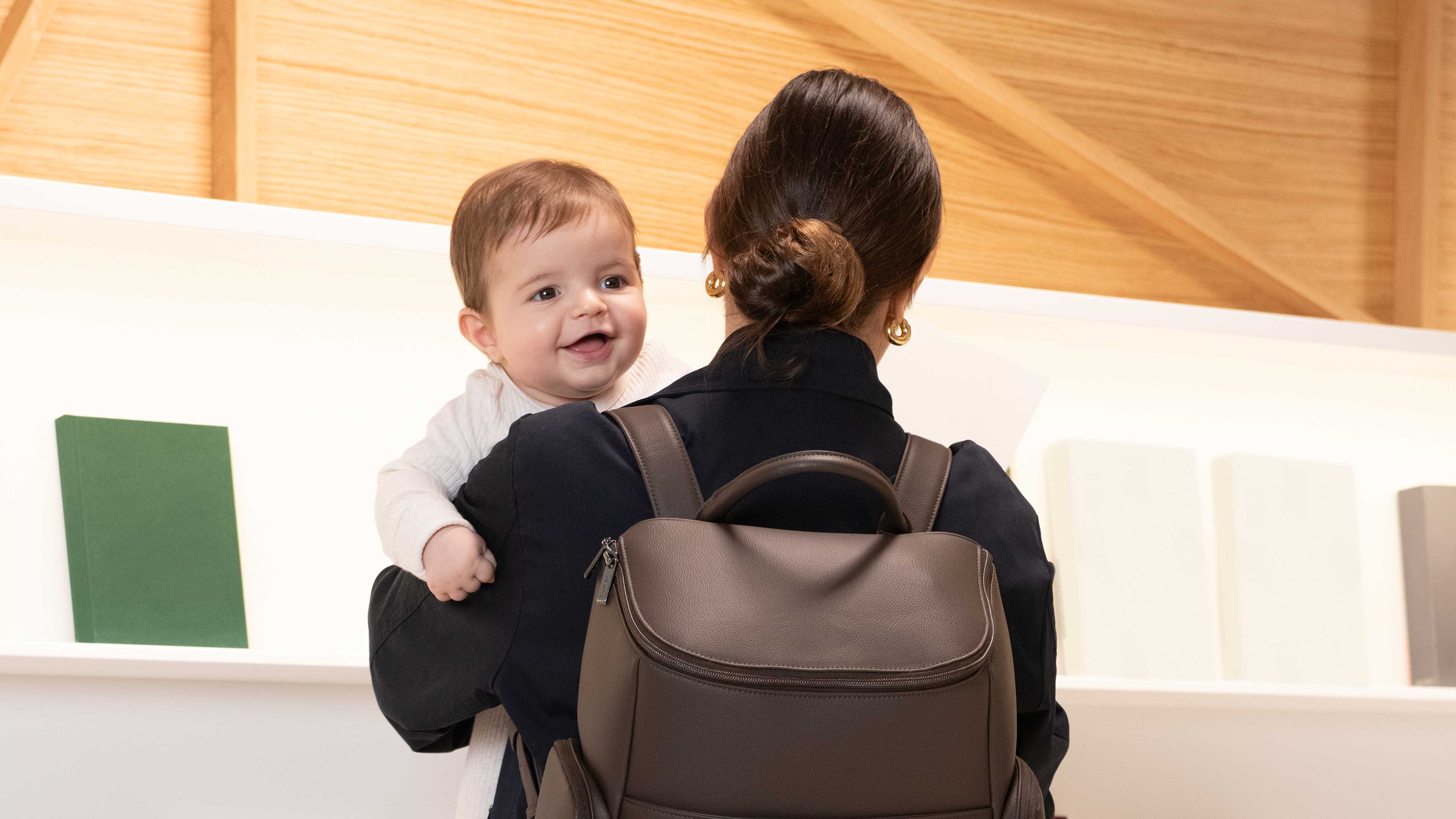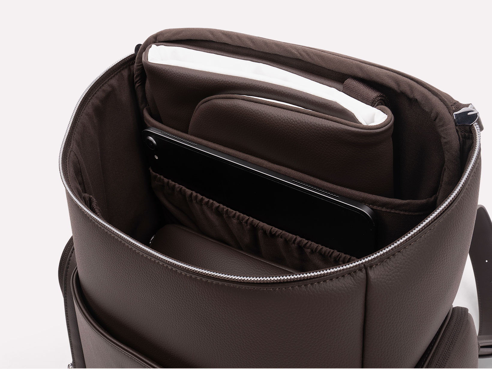 Le sac Essential redéfinit le luxe quotidien grâce à son style chic avec effet cuir surpiqué, sa fonctionnalité et sa polyvalence. Conçu comme un sac à dos multitâches qui sert également de sac à langer, son design est aussi adapté à un ordinateur portable avec une série de poches extérieures et intérieures bien pensées, une pochette pratique pour le matelas à langer et une pochette pour trolley pour faciliter les déplacements.