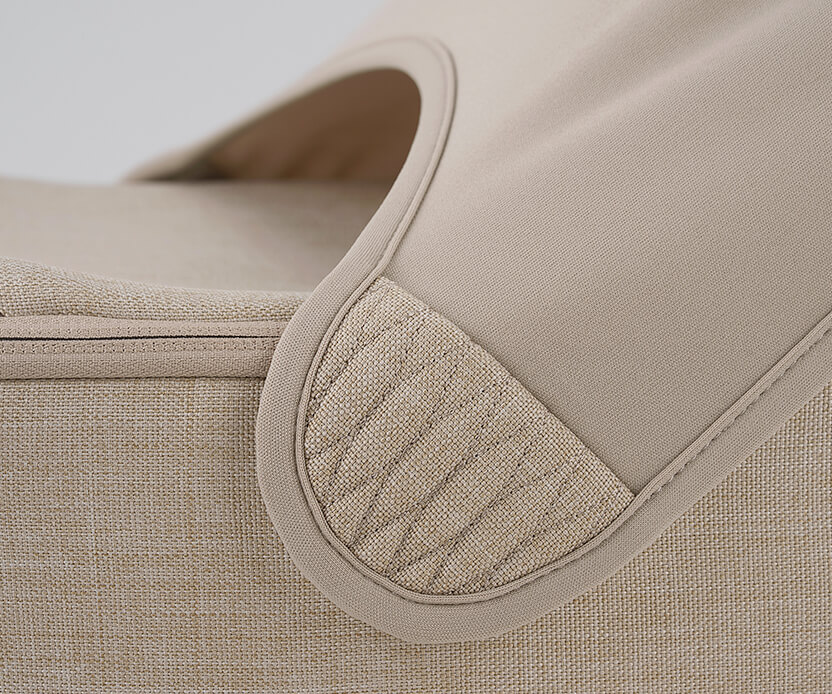 Een rustige, elegante linnenkleur wordt gecombineerd met fijne gestikte details, borduursels in warm mokkabruin, elegante touches en hoogwaardige leatherette accenten. Een subtiel metalen logo maakt de look af en straalt de natuurlijke energie uit van het levenin de stad.